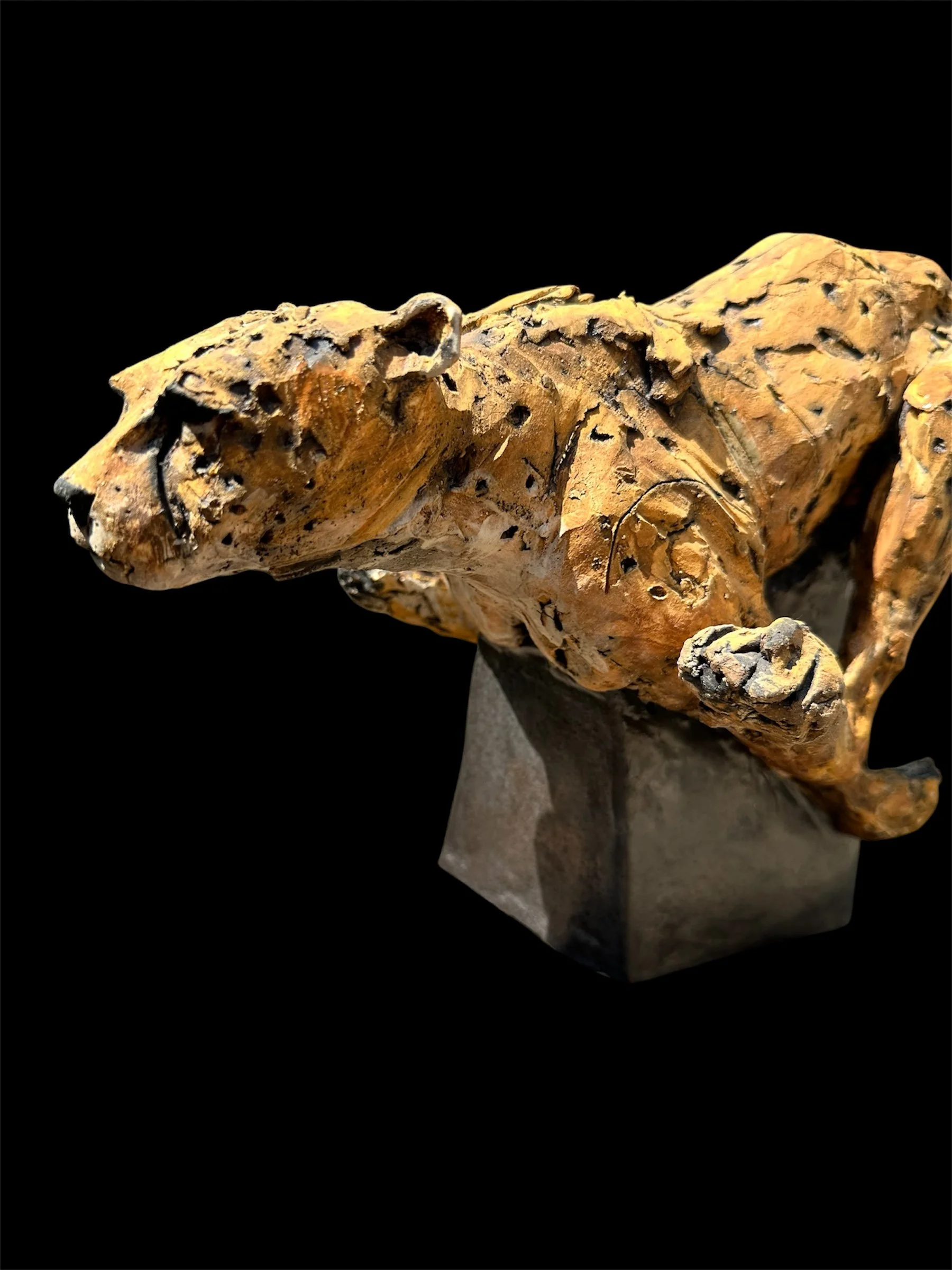 Built using Ashraf Hanna Raku body clay and various oxides and underglazes to colour her. She stands 15” tall to the tip of her tail and 22” long from nose to tail; the wisest point this 8”